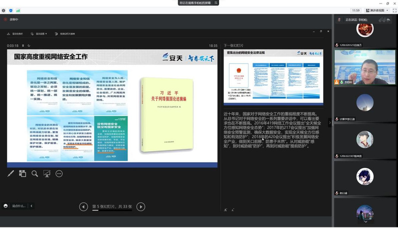 12月15日晚,太阳集团tyc1512003202班企业班主任、安天科技集团股份有限公司研究院副院长、集团技术委员会常务副主任李柏松为全体同学带来了以网络安全产业发展与信息安全领域热点技术为主题的线上交流分享会。班主任叶麟、辅导员王迪参加活动。