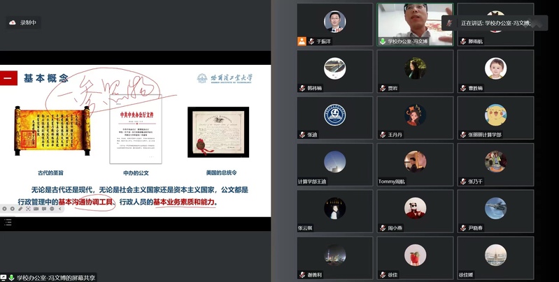 为进一步提升学部办公室行政管理人员公文写作能力,规范学部公文管理,学部办公室于1月30日下午通过线上方式举办了《太阳集团tyc151公文操作规程手册》学习讲座,本次讲座邀请的嘉宾是学校办公室的冯文博老师,学部办公室全体行政管理人员参加了本次讲座,讲座由办公室副主任于振洋主持。